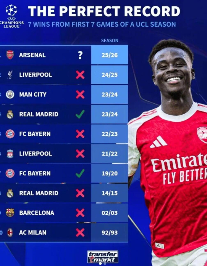 欧冠联赛阶段第七轮,阿森纳3-1战胜国际米兰,实现本赛季欧冠开局七连胜。